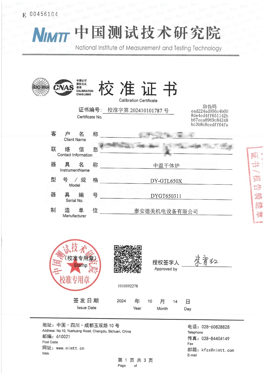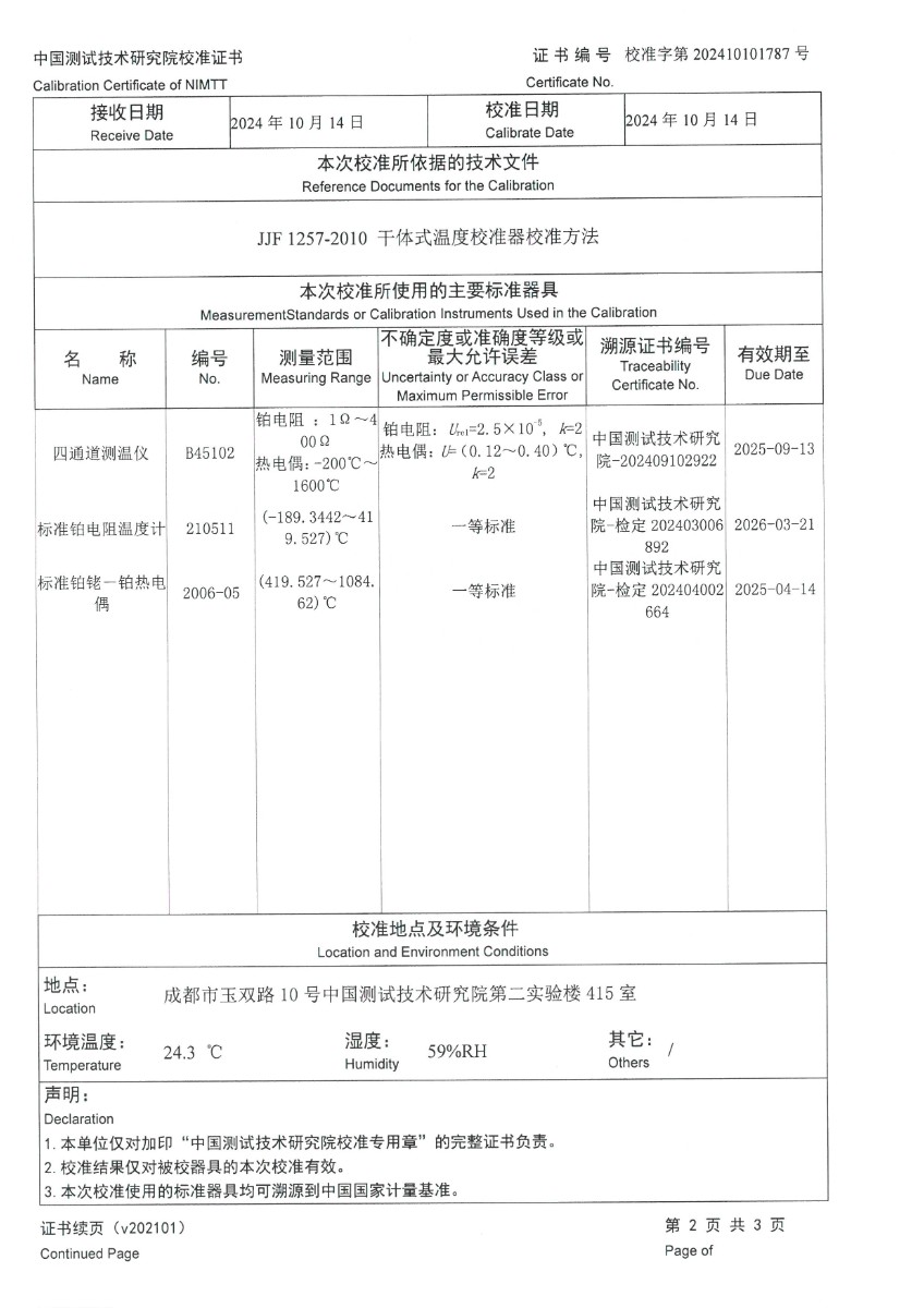 中溫干體爐(50(30)~650℃)校準證書 2024-10-17 本文被閱讀 7505 次