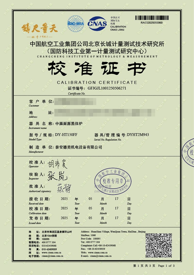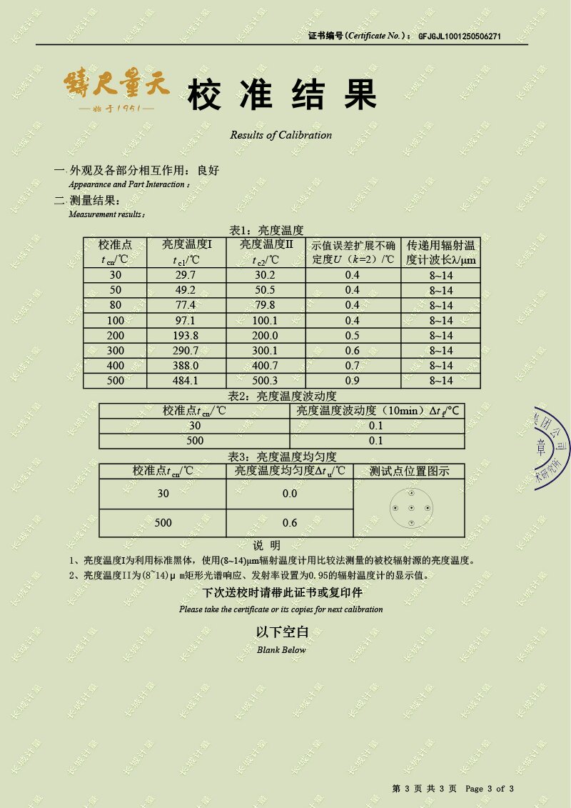 中溫面源黑體爐(室溫+5-500℃)校準證書 2025-5-21 本文被閱讀 4170 次