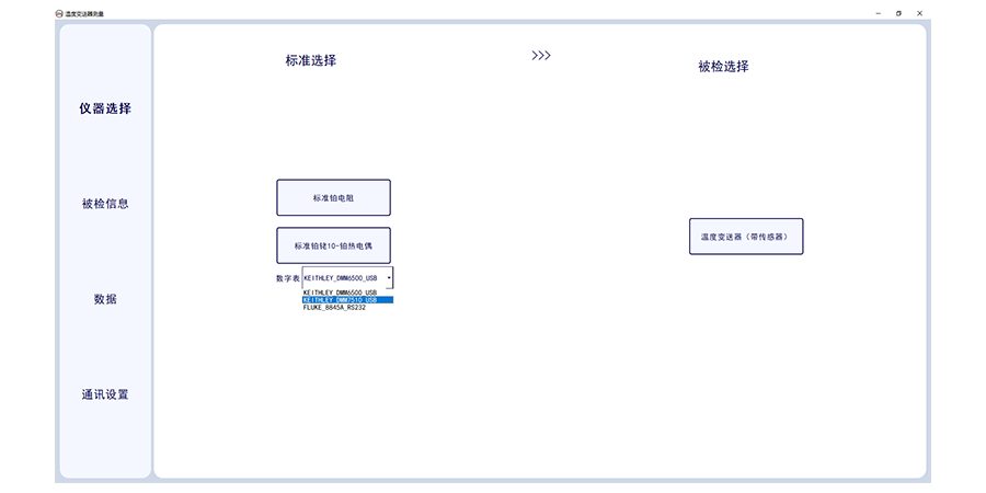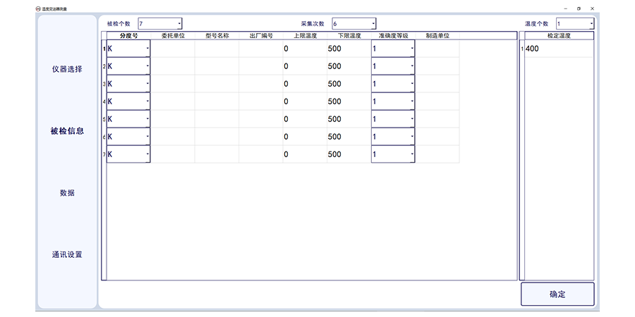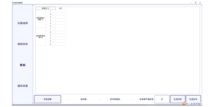 溫度變送器計(jì)量校準(zhǔn)上位機(jī)軟件,此軟件適合溫度變送器的輸出電流采集,軟件需要溫度變送器(帶傳感器)配套標(biāo)準(zhǔn)器、恒溫設(shè)備及相應(yīng)數(shù)字萬用表。軟件可選擇多個(gè)被檢傳感器,可設(shè)置采集次數(shù),及溫度個(gè)數(shù)及溫度點(diǎn)。軟件可輸入委托單位,型號名稱出廠編號及準(zhǔn)確度等級及制造單位。