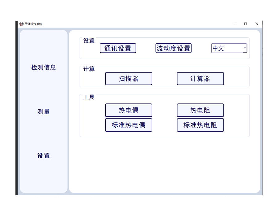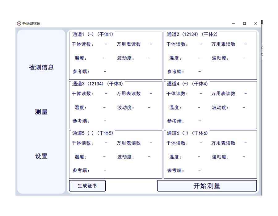 測量狀態(tài)可進行多通道狀態(tài)干體爐,萬用表讀數(shù)。當前標準器溫度,溫度波動性等數(shù)據(jù)的讀取,并一鍵生成證書??蓪崿F(xiàn)一鍵中英文切換。
