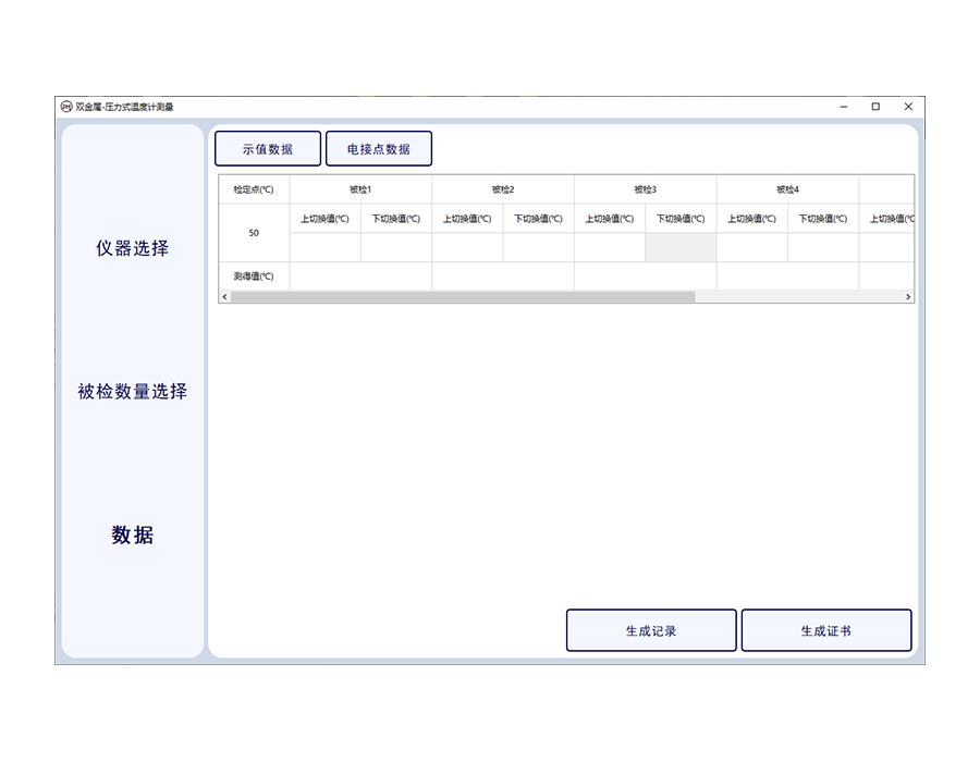 雙金屬溫度計(jì)軟件為DY-01熱工系統(tǒng)的配套軟件,可通過(guò)讀取雙金屬溫度計(jì)計(jì)壓力式溫度計(jì)數(shù)據(jù),記錄數(shù)據(jù)文件,并對(duì)數(shù)據(jù)文件進(jìn)行分析提取及計(jì)算,并可按照相關(guān)規(guī)程、規(guī)范輸出溫濕度場(chǎng)巡檢記錄及測(cè)試報(bào)告、證書(shū)等。