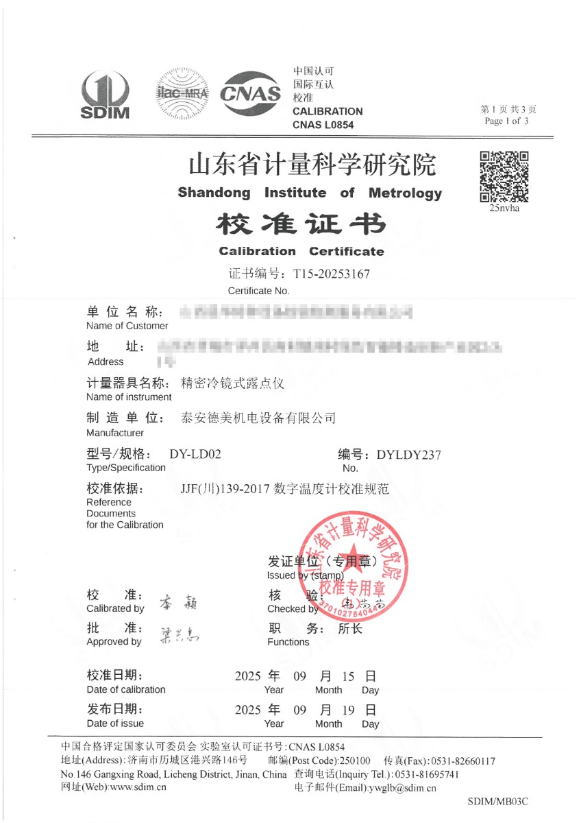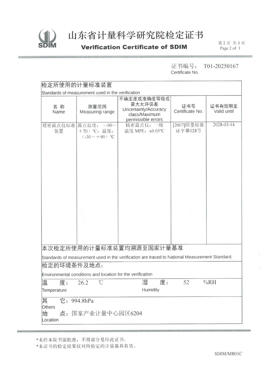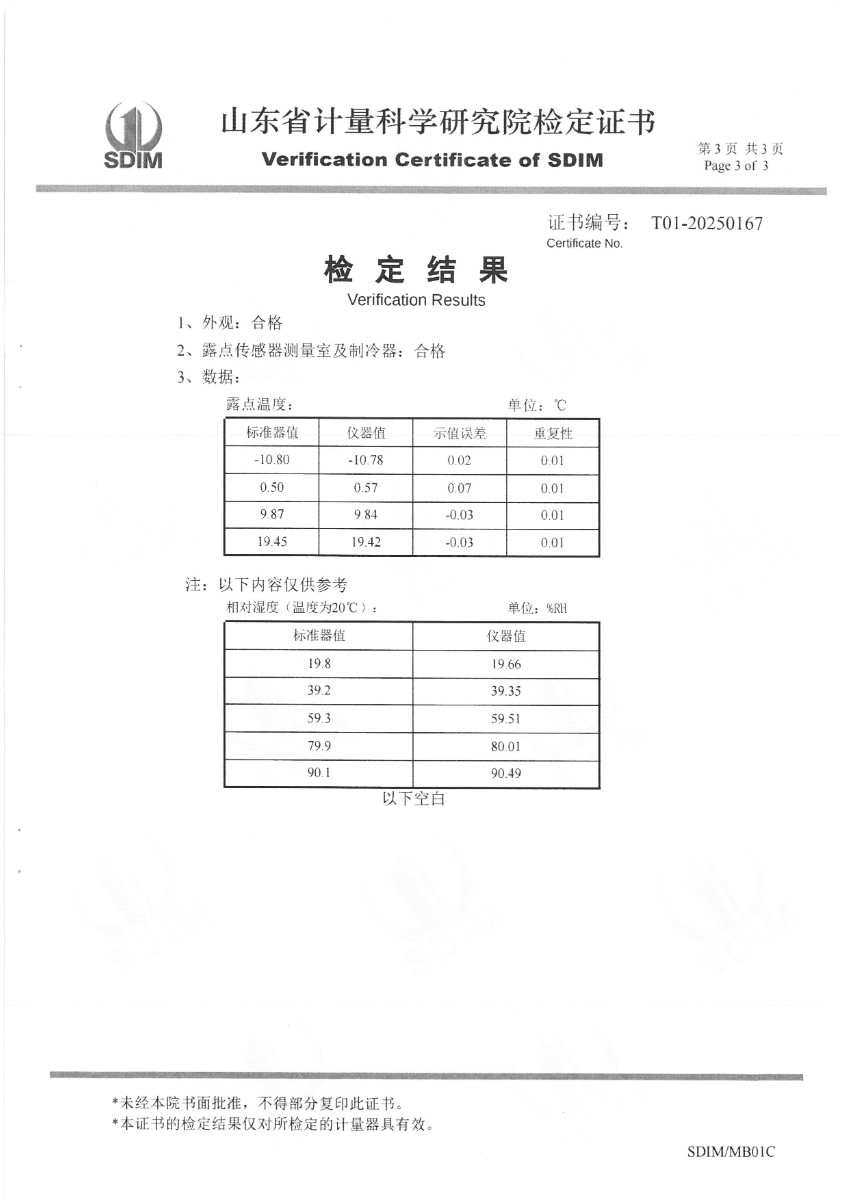 冷鏡式露點儀檢定、校準(zhǔn)證書