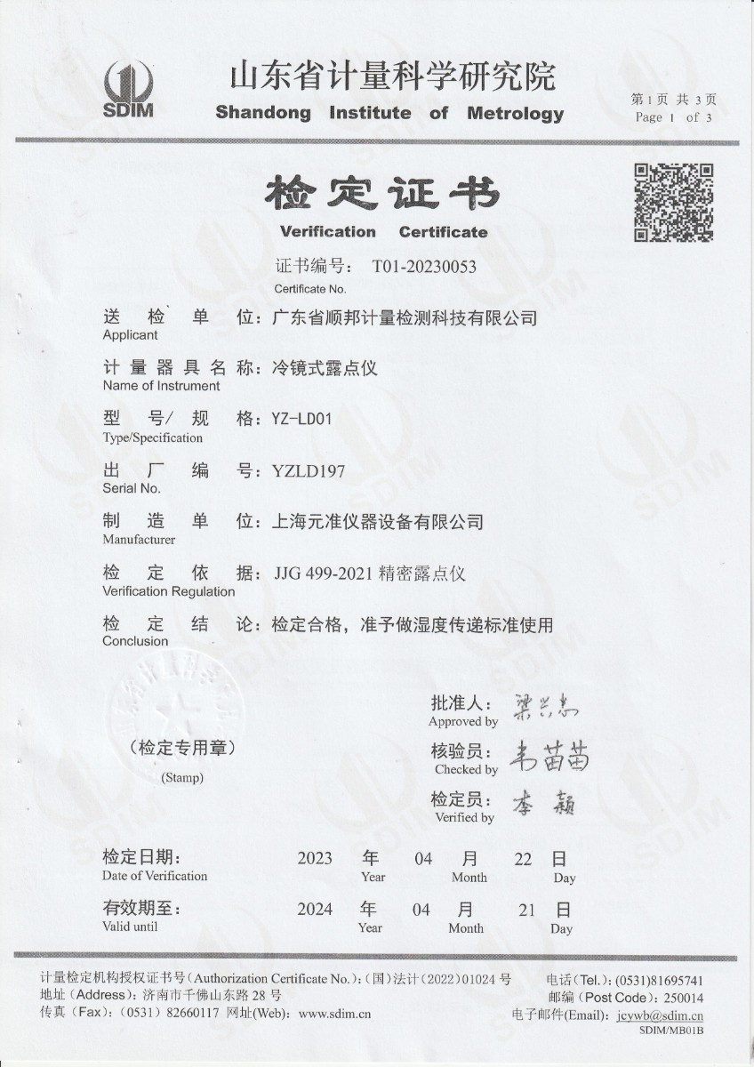 廣東省順邦計(jì)量檢測科技有限公司 冷鏡式露點(diǎn)儀 檢定證書 2023-5-4 本文被閱讀 9642 次