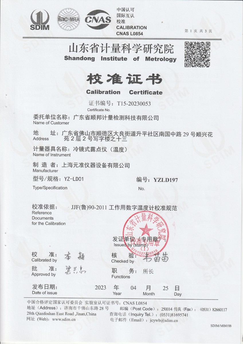 | 上一條:廣東省順邦計量檢測科技有限公司 冷鏡式露點儀 檢定證書 | 下一條:DY-HT2M-C高溫面源黑體爐(100mm) |