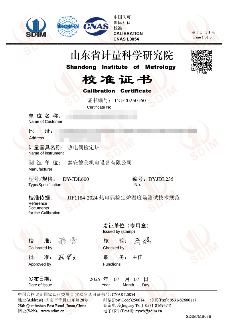 熱電偶檢定爐(300-1200℃)校準證書 2025-7-10 本文被閱讀 4151 次