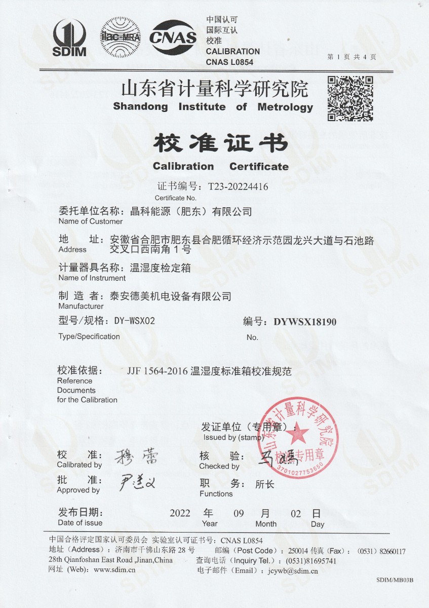 晶科能源(肥東)有限公司-溫濕度檢定箱 2022-9-15 本文被閱讀 17395 次