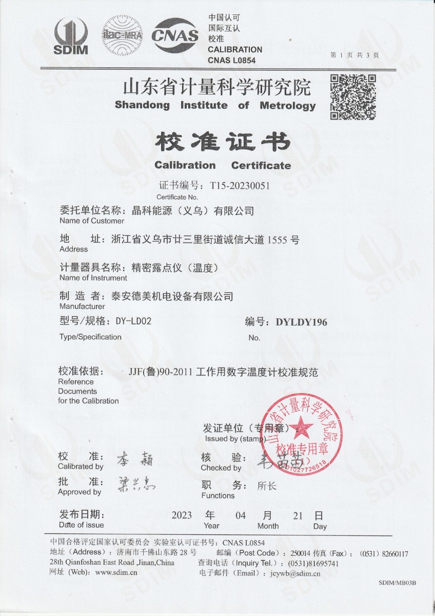| 上一條:晶科能源(義烏)有限公司 精密露點儀 檢定證書 | 下一條:DY-HT2M-C高溫面源黑體爐(100mm) |