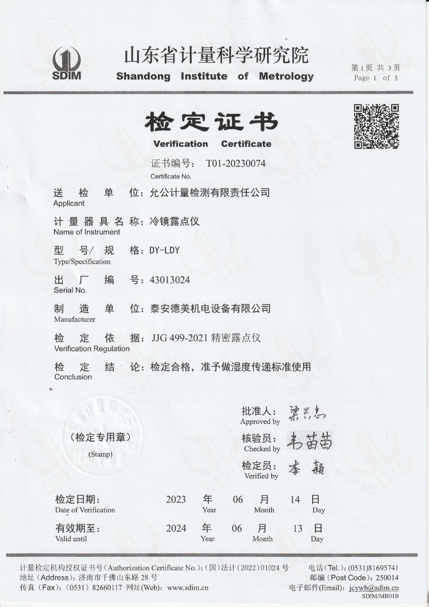 | 上一條:允公計(jì)量檢測有限責(zé)任公司-冷鏡露點(diǎn)儀校準(zhǔn)證書 | 下一條:DY-HT2M-C高溫面源黑體爐(100mm) |
