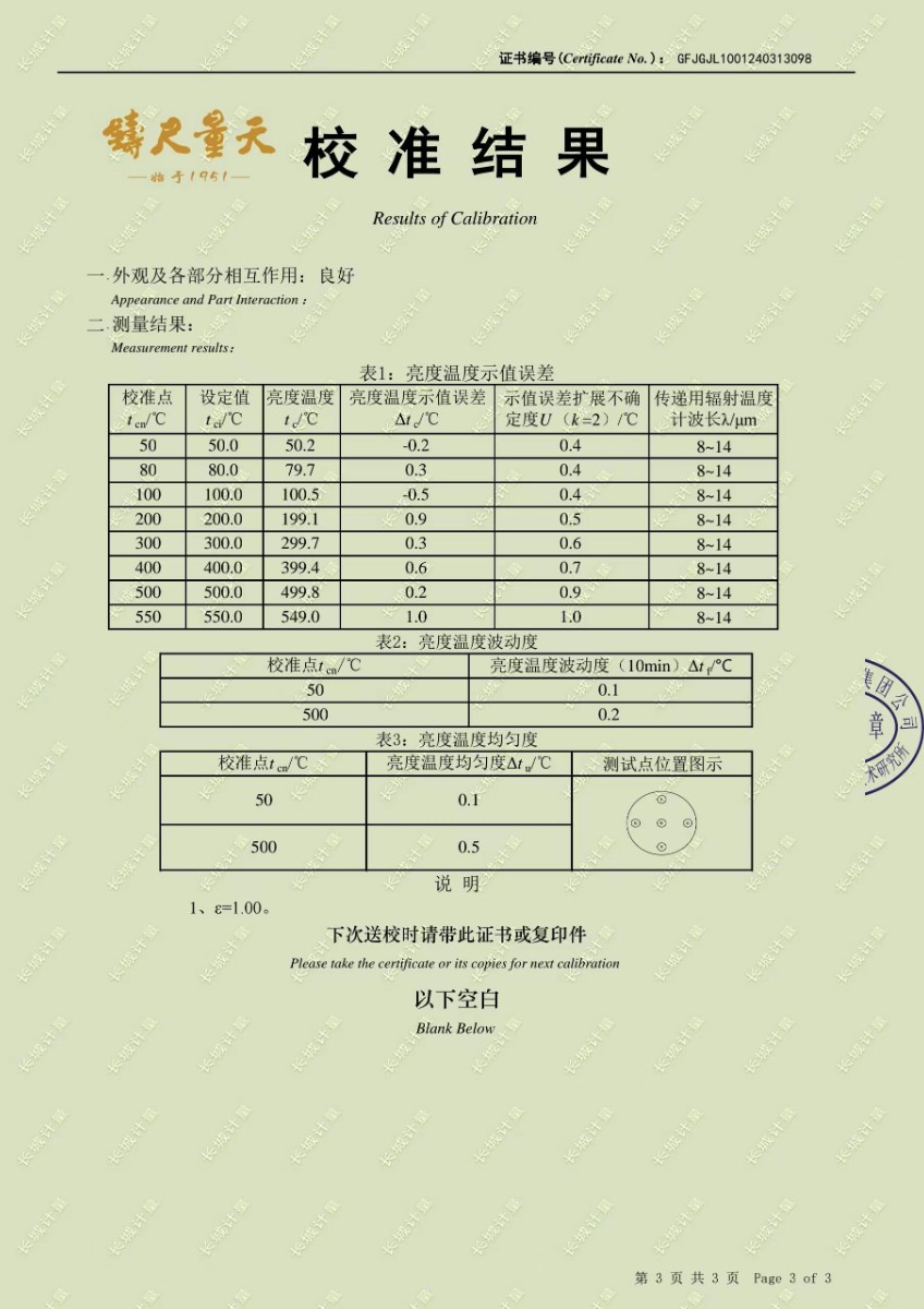 黑體輻射源校準證書 2024-4-11 本文被閱讀 6919 次