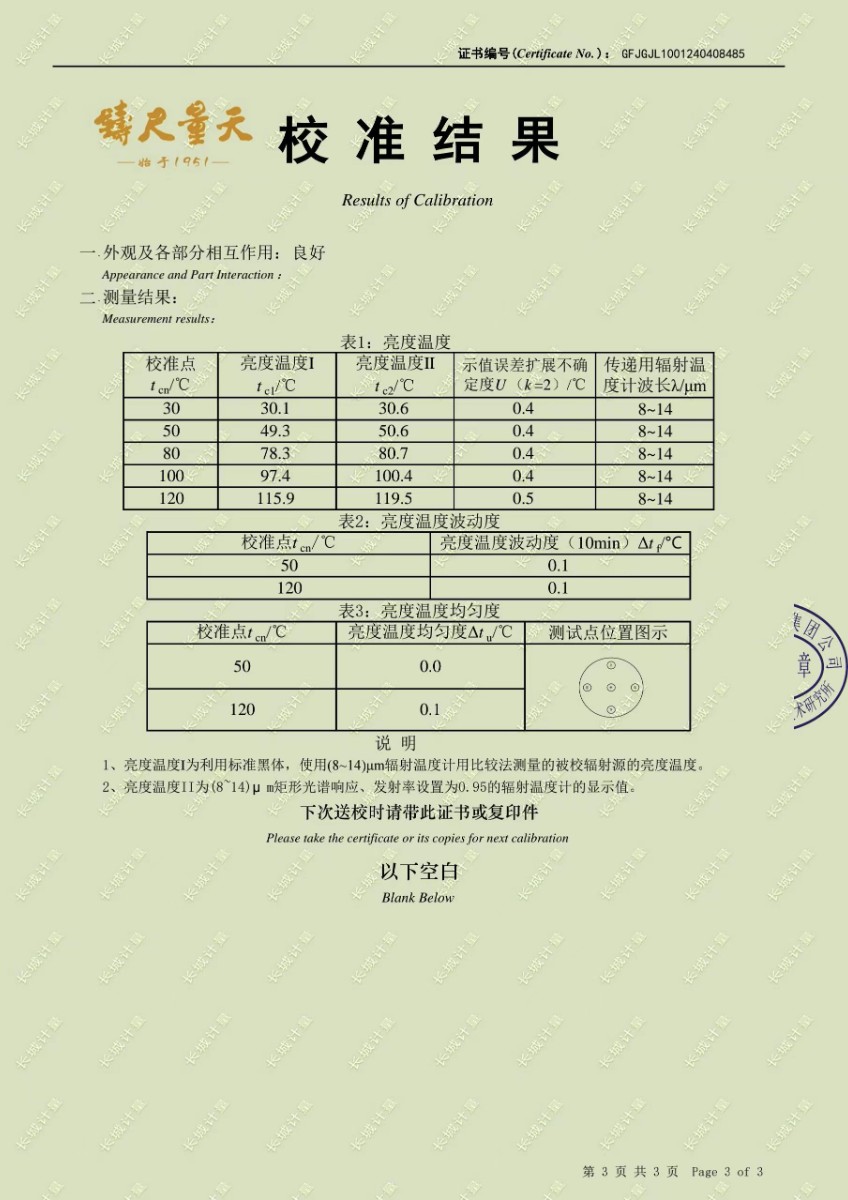 小尺寸高精度中溫黑體校準(zhǔn)證書
