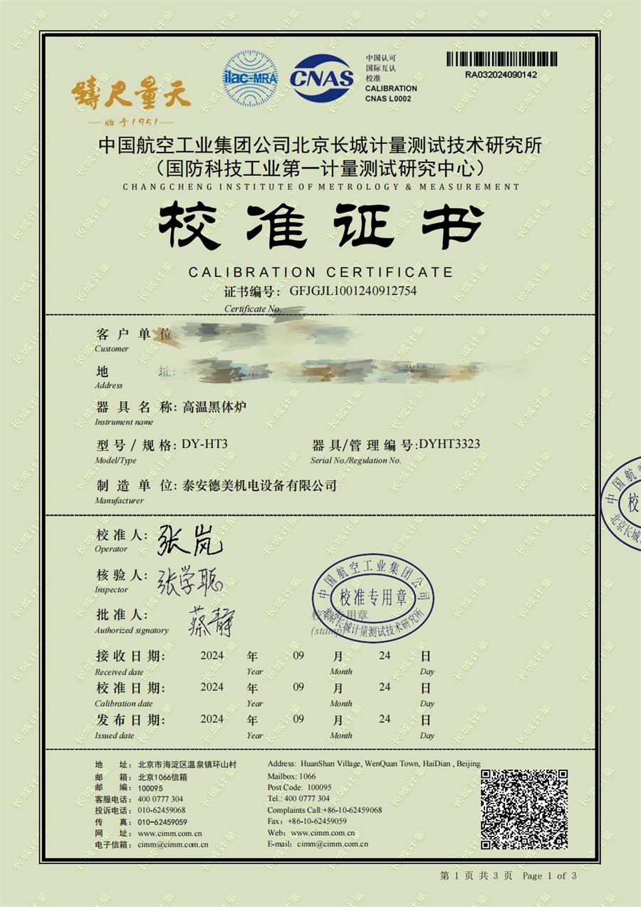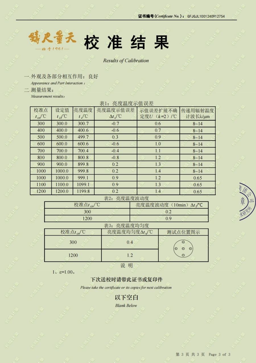 高溫黑體爐(300-1200℃)校準證書 2024-10-17 本文被閱讀 6192 次