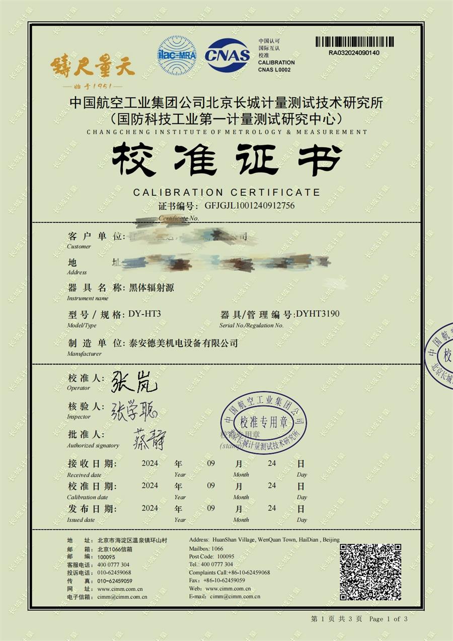 | 上一條:中溫黑體爐(50-500℃)校準(zhǔn)證書 | 下一條:DY-HT2M-C高溫面源黑體爐(100mm) |