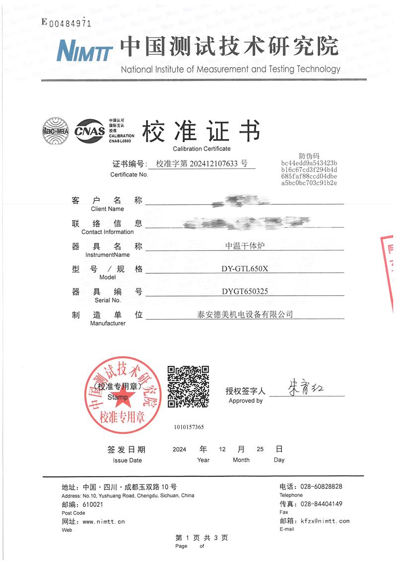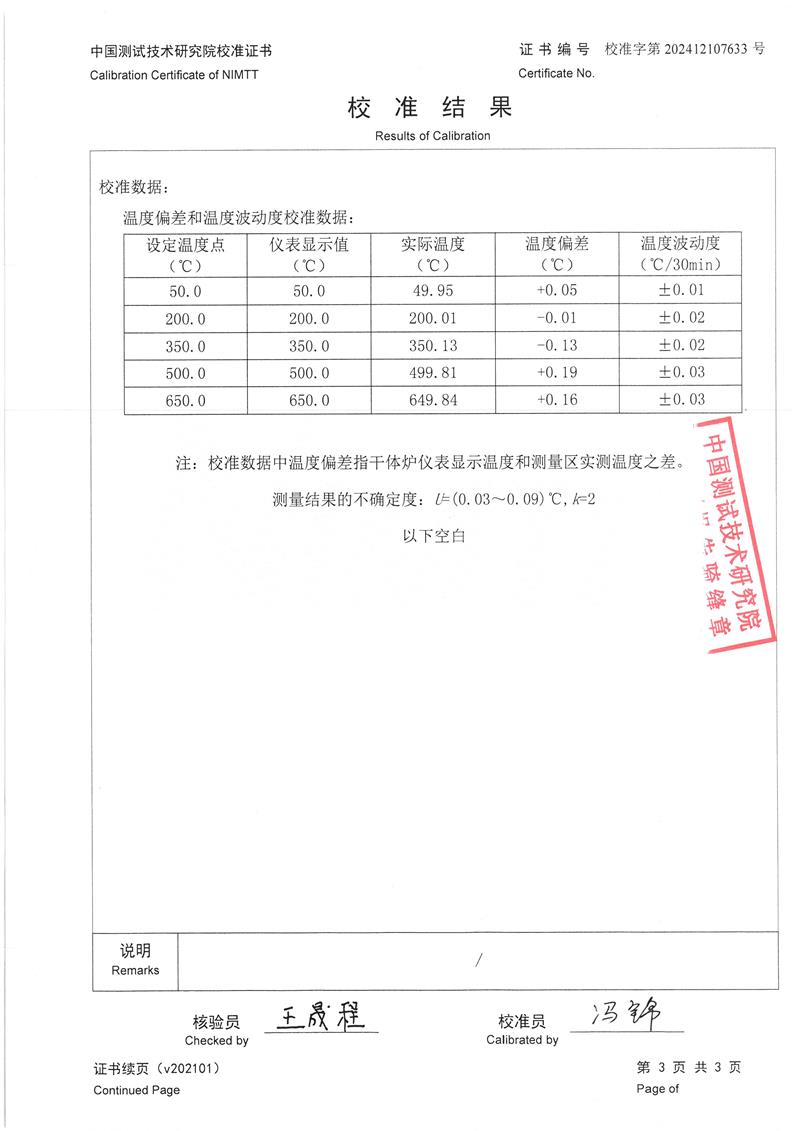 中溫干體爐(50~650℃)校準(zhǔn)證書 2025-1-2 本文被閱讀 7841 次