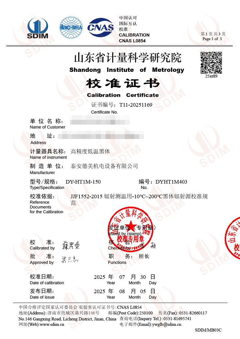 高精度低溫黑體(-10-100℃)校準證書