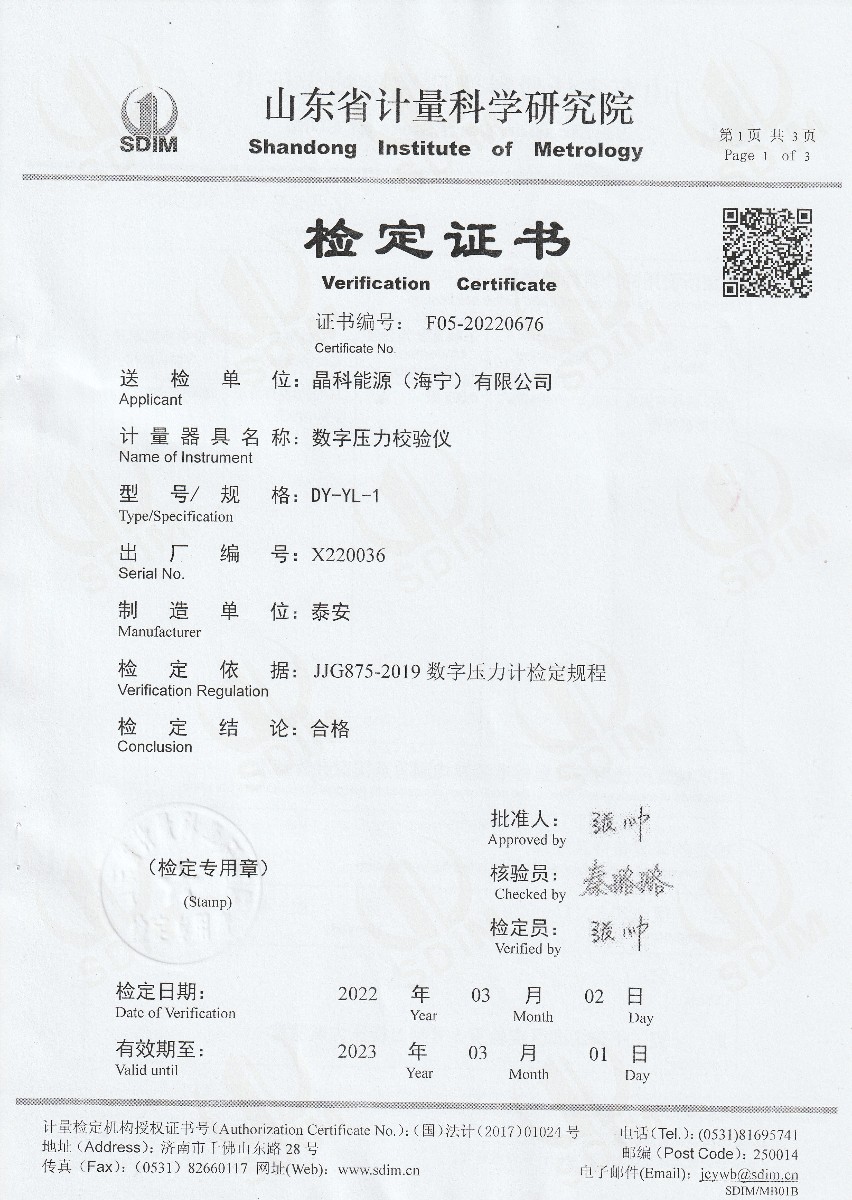晶科能源(海寧)有限公司-數(shù)字壓力計校驗儀 2022-3-16 本文被閱讀 12731 次