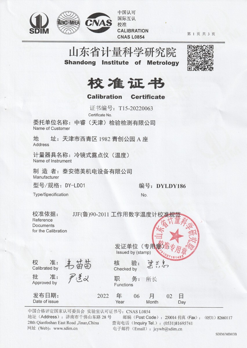 中睿(天津)檢驗檢測有限公司-冷鏡式露點儀校準證書 2022-6-14 本文被閱讀 15933 次