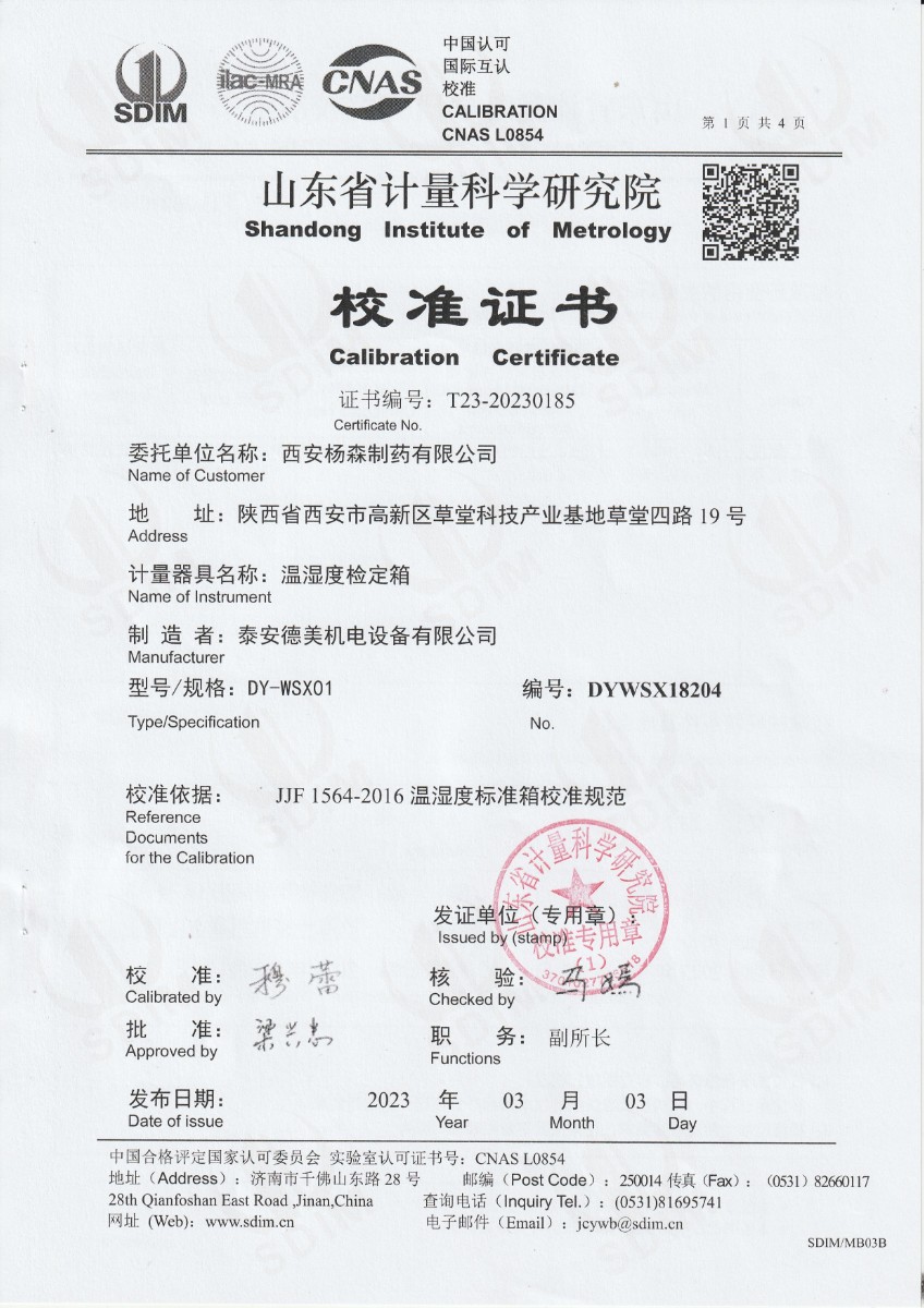 西安楊森制藥有限公司 溫濕度檢定箱 校準(zhǔn)證書 2023-3-13 本文被閱讀 12857 次