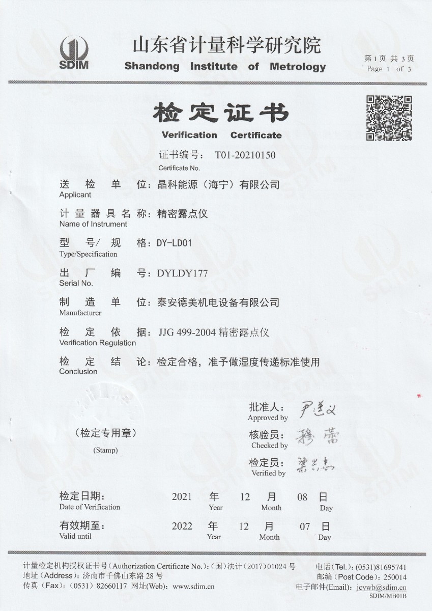 晶科能源(海寧)有限公司-精密露點儀(濕度) 2021-12-14 本文被閱讀 14822 次